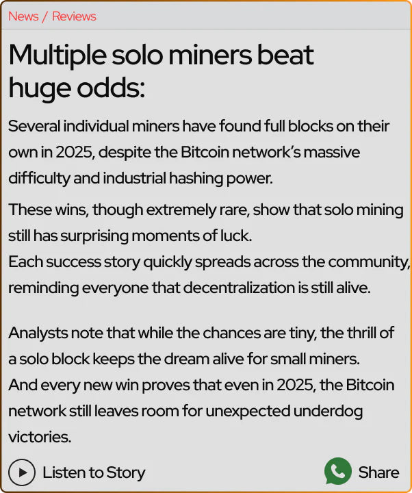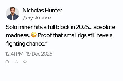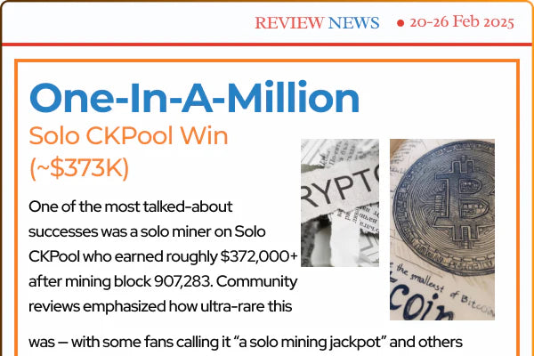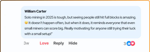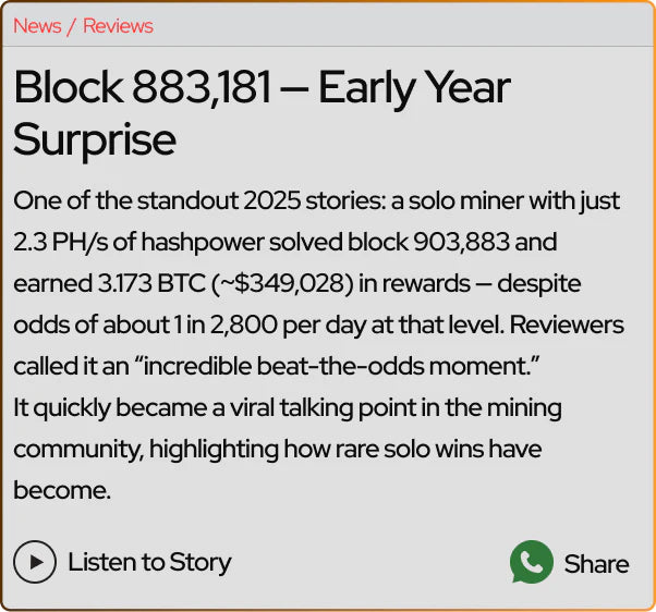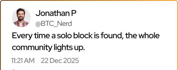 Disclaimer: These examples reference publicly reported solo mining events on the Bitcoin network. Results may vary.